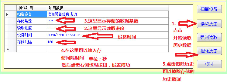 點擊右側的刷新,在串口號后面選擇剛才查看到的COM口號,點擊查找,此時軟件會識別到設備信息,并在左側顯示出來。①讀取數據,可以觀察到傳感器的實時數據。②讀取歷史數據:點擊讀取歷史可讀取歷史數據